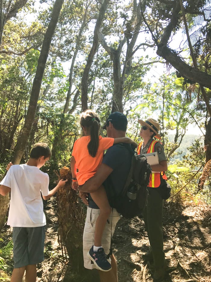 We took a day trip out to Hawaii Volcanoes National Park. It’s quite a drive from the other side of the island so be sure to give yourself plenty of time and you may want to bring snacks or a lunch with you as well since the options on the road are slim and few and far between. At the National Park, we did what we always do when we first arrive, talk with the rangers at the visitors center. They give you the best information based on your timeframe, activity level and interests. We often end up on a ranger-led nature walk. They are so full of information and stories, we all learn so much from the National Park rangers. Before heading out, the kids pick up their Junior Ranger Activity Books and get their National Park Passport Books stamped – a must for us – and favorite souvenir every time.